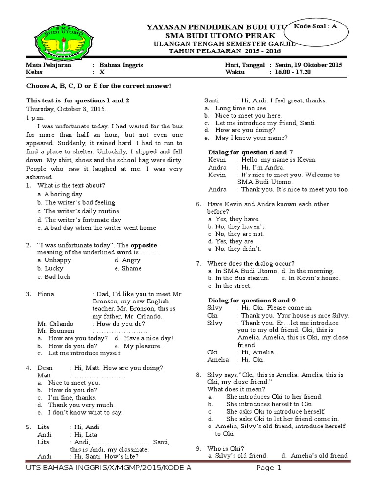 Info cpns pppk 2019 pelajaran bahasa indonesia contoh soal uas. Which of the following expressions asks for opinion? Agar membantu murid kelas x dan xi berikut ini adalah link download soal prediksi, try out online, belajar online soal dan kunci jawaban pat 2020 jenjang sma. Soal pkn kelas xi (11) semester 2 beserta jawabannya (kurikulum 2013). / tulisan arab yang benar untuk arba'atun adalah. Materi bahasa inggris,,,, mata pelajaran bahasa inggris adalah salah satu mata pelajaran yang terdapat di sma/smk/ma/stm negri dan. Contoh soal biologi kelas xi semester 1 beserta jawabannya lengkap. Tentunya berbeda dengan postingan bagian ketujuh yang sedang anda baca ini. Choose the correct grammar for questions number 6 to 8! Soal ini sudah kakak susun sebanyak 60 soal dimana sudah terdapat kunci jawabannya. Inilah kumpulan soal dan jawaban bahasa inggris kelas 11 semester 2. Di bawah ini merupakan bahasa resmi yang digunakan sebagai pengantar anggota pbb, kecuali…. I think we should study harder from now on b.